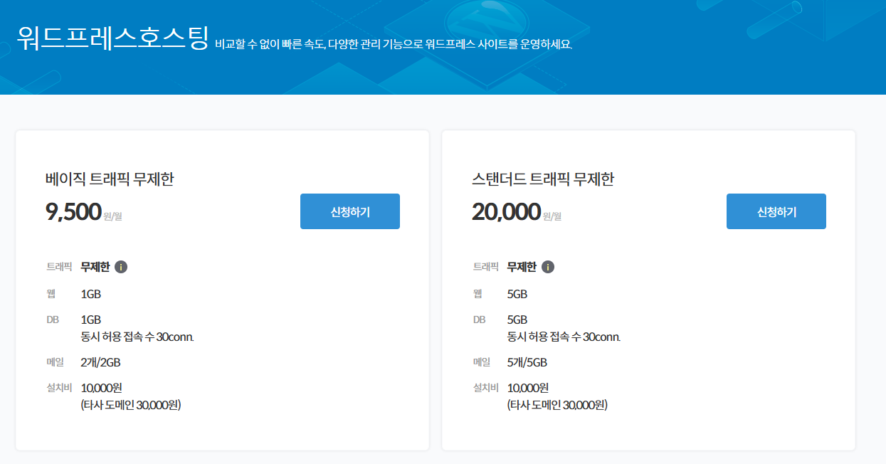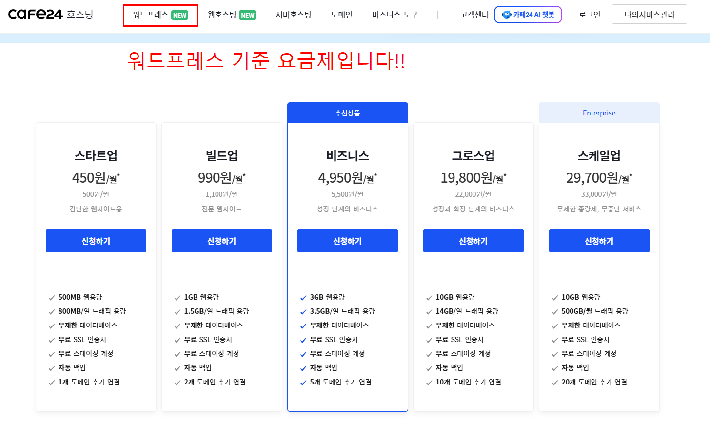 | 블로그/워드프레스 운영 | 카페24 일반형 | 한글 지원 + 국내 고객센터 + ₩5,500 저가 시작 |