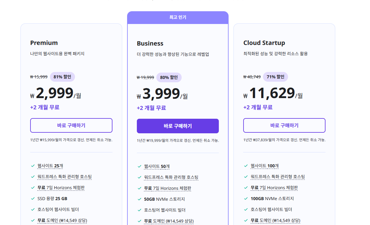 - 장점: 관리형 + 셀프 관리형 모두 지원, 자체 SPanel 제공, 무료 SSL 및 백업 포함