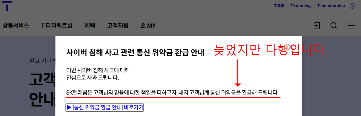 - “이번 사이버 침해 사고에 대해 진심으로 사과 드리며, 해지 고객님의 통신 위약금을 환급해 드립니다.”라는 공식 안내 발표 (2025.07.04)