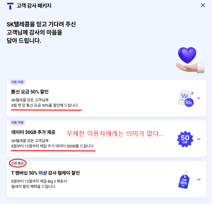 실제 통신 요금 50% 할인, 데이터 50GB 추가 제공, 재가입 시 T멤버십 복원 등은 단기 할인 이상의 실질적 혜택을 제공합니다.