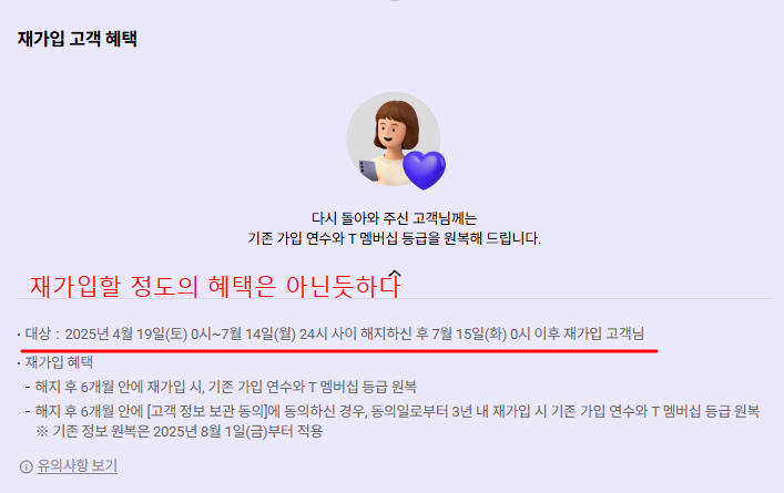 - 2025년 4월 19일 0시~7월 14일 24시 사이 해지 후 재가입한 고객